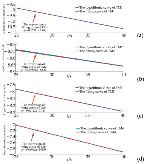 When t = 0 s, the excitation signal disturbance was added, and then the signal was removed at 15 s. The rotational speed curve of SG shafting in torsional vibration mode is shown in Figure 7. The logarithm of the ωr amplitude was taken and curve-fitting was performed. The fitting results are shown in Figure 8, and the attenuation coefficients of TM1–TM4 were −0.1235, −0.007909, −0.02113, and −0.06042, respectively.