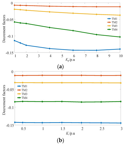 It can be seen from Figure 9 that, when the number of grid-connected DFIGs was given, and when Kp changed from 1 p.u. to 10 p.u., the attenuation coefficients of the torsional vibration modes of SG shafting generally showed a trend of decrease, whereby the attenuation coefficient of TM1 decreased 1.2-fold, the attenuation coefficients of TM2 and TM3 decreased 1.7-fold and 1.9-fold, and the attenuation coefficient of TM4 decreased 1.8-fold. The damping characteristics of the modes were enhanced, and, within the same time range, TM1 changed more obviously. As the integral coefficient of the current inner loop increased, the attenuation coefficients of the torsional modes of the SG did not change significantly.