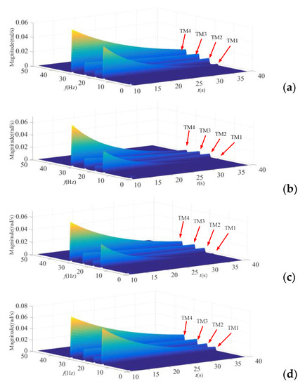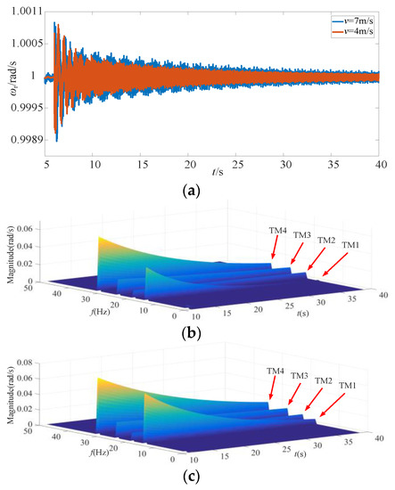 It can be seen from Figure 10 that, as the wind speed increased from 4 m/s to 7 m/s, the attenuation coefficients of the torsional modes of SG shafts increases, and the mode damping characteristics weakened. Specifically, the attenuation coefficients of TM1–TM4 increased 1.6-fold, 1.8-fold, 1.5-fold, and 1.3-fold, respectively.