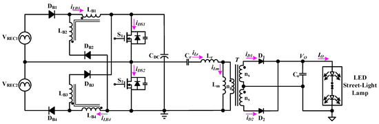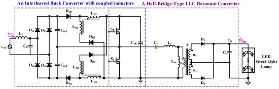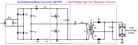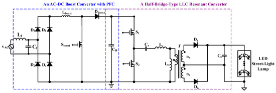 The street-light lamps widely installed on roads, streets, parks, squares, public places, and decorative outdoor lighting areas have the function of providing night lighting, being are usually lit at night or in the dark and extinguished in the early morning. The traditional street lighting source is a high-pressure mercury lamp featuring low installation cost. However, it has the disadvantages of poor luminous efficiency and high energy consumption, as well as the problems of mercury pollution and being difficult to start up in low-temperature circumstances. In recent years, high-pressure mercury lamps have been replaced by light-emitting diode (LED) street-lights with their attractive characteristics of environmental protection and energy-saving [1,2]. For instance, comparing an LED street-light lamp with a high-pressure mercury one under approximately the same output luminous flux, the LED version has a 50% lower power consumption (120 W vs. 250 W), a 50% higher lighting efficacy (110 lm/W vs. 52 lm/W), and a longer average lifetime (50,000 h vs. 24,000 h) [3,4]. Generally, the power supply circuit of LED street-light lamps uses AC mains as the input power. The first stage is an AC-DC power converter with power factor correction (PFC) function and the second stage is a DC-DC power converter to provide the rated DC voltage and current required by the LED street-light lamp [5,6,7,8]. The traditional two-stage AC-DC high power factor power supply (HPFPS) for providing an LED street-light lamp includes an AC-DC boost converter as the first-stage circuit featuring PFC and a DC-DC half-bridge LLC resonant (HB-LLCR) converter as the second-stage circuit to supply the LED street-light lamp with rated power. Figure 1 shows the two-stage AC-DC power supply for providing an LED street-light lamp that consists of a boost converter with PFC and a HB-LLRC converter [8]. In their respective studies, [9,10,11,12,13,14,15,16,17,18] developed and implemented the integration of the first-stage AC-DC converter and the second-stage DC-DC converter into a single-stage LED power supply, which is characterized by improved circuit efficiency and reduction in the number of circuit components. An existing single-stage HPFPS for furnishing an LED street-light lamp merging with an interleaved boost converter and a HB-LLC converter was developed in [18], as depicted in Figure 2. The AC-DC power supplies as shown in Figure 1 and Figure 2 for providing an LED street-light lamp are based on boost-type power conversion in the front-part circuit, and the voltage stresses of the DC-link capacitor and power switches are high.