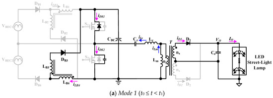 Mode 1 (the equivalent circuit as shown in Figure 5a): suppose that in the previous mode, the energy stored in the parasitic capacitor of the power switch S1 is released, so that the switch voltage vDS1 drops to zero, causing the essential diode of the switch S1 to be turned on at time t0. The resonant inductor Lr and the magnetizing inductor Lm offer energy to the parasitic capacitor of the power switch S2 and the DC-link capacitor CDC and the resonant capacitor Cr by way of the essential diode of the switch S1, and offer energy to the output capacitor Co and the LED street-light lamp via the transformer T and the output diode D1. Since the diode DB3 is forward-biased and turned on in the previous mode, the coupled inductors LB3 and LB4 offer energy to the DC-link capacitor CDC by means of the diode DB3. When the current iLr of the resonant inductor Lr is decreased to zero, this mode finishes.