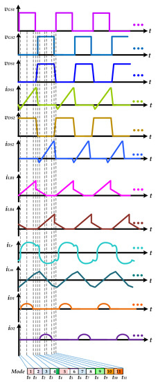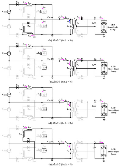 The operational modes and theoretical waveforms of the presented LED power supply are shown in Figure 5 and Figure 6, respectively, and the circuit analysis along with the operating of the LED power supply is described and discussed in detail below.