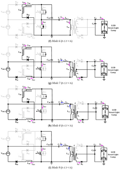 Mode 9 (the equivalent circuit as shown in Figure 5i): the rectified equivalent voltage source VREC2 holds on providing energy to the inductor LB4 by way of the diode DB4 and the switch S2, and the inductor current iLB4 keeps on rising linearly. The DC-link capacitor CDC continuously provides energy to the parasitic capacitor of the switch S1 by means of the power switch S2. The resonant capacitor Cr continuously supplies energy to the resonant inductor Lr, magnetizing inductor Lm, output capacitor Co, and the LED street-light lamp by way of the switch S2, the transformer T, and the diode D2. When the diode current iD2 drops to zero at time t9, this mode completes.