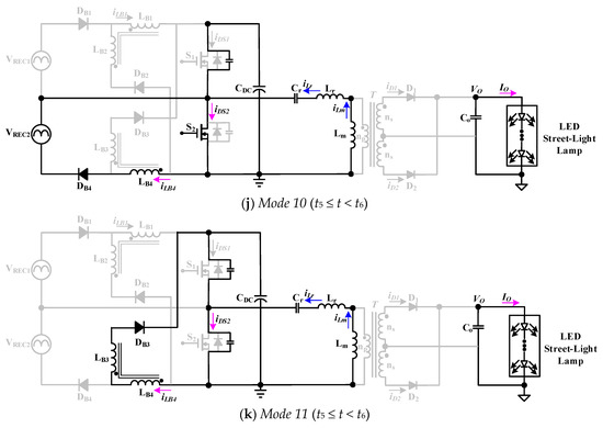Mode 10 (the equivalent circuit as shown in Figure 5j): the rectified equivalent voltage source VREC2 continuously supplies energy to the inductor LB4 by means of the diode DB4 and the switch S2, and the inductor current iLB4 continues to show a linear increase. The DC-link capacitor CDC continuously offers energy to the parasitic capacitor of the switch S1 by way of the power switch S2. The resonant capacitor Cr continuously offers energy to the resonant inductor Lr and the magnetizing inductor Lm by means of the switch S2. The output capacitor Co offers energy to the LED street-light lamp. When switch S2 is turned off at time t10, this mode completes.