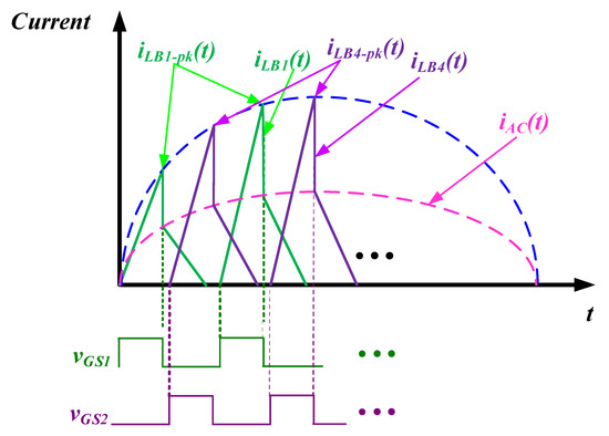 Theoretical waveforms of the coupled inductors currents iLB1 and iLB4 along with the input utility-line current iAC at the positive half-cycle.