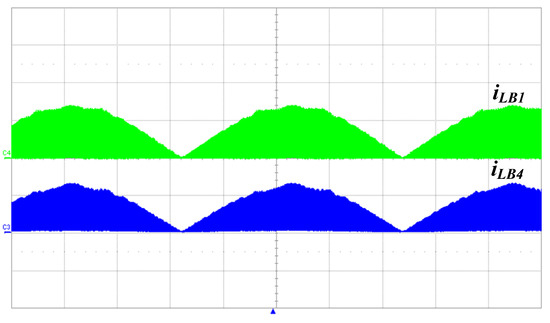 Experimental waveforms of the coupled-inductor currents iLB1 (5 A/div) and iLB4 (5 A/div); time scale: 2 ms/div.