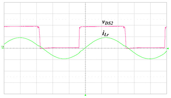 Experimental waveforms of the switch voltage vDS2 (100 V/div) and the resonant inductor current iLr (2 A/div); time scale: 2 μs/div.