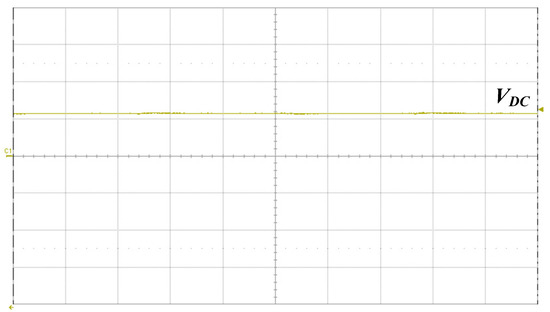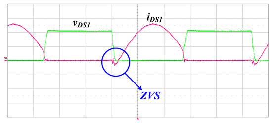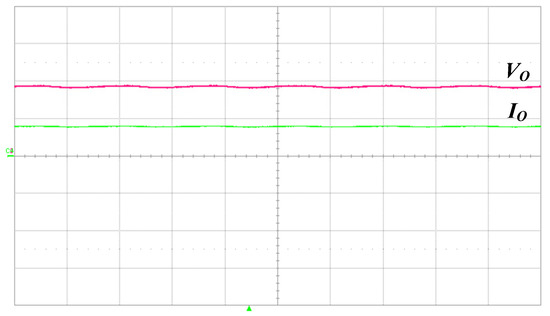 Figure 8 demonstrates experimental waveforms of coupled inductor currents iLB1 and iLB4. Figure 9 presents the experimental waveforms of the power switch voltage vDS2 and the resonant inductor current iLr. From the waveform, it is known that the voltage waveform leads the current waveform, and thus the resonant network has the characteristics of an inductive load. Figure 10 demonstrates the experimental waveforms of the power switch voltage vDS1 and current iDS1. It can be seen that ZVS was achieved on the power switch, which can reduce the switching losses of the power switch. Figure 11 presents the experimental waveforms of the power switch voltage vDS1 and the diode current iD1. The waveform diagram shows that the output diode had the characteristic of zero-current switching (ZCS), which can reduce the conduction loss of the power diode. Figure 12 presents the experimental waveform of the DC-link voltage VDC, with the average level of the DC-link voltage being 228.7 V. Figure 13 demonstrates the experimental waveforms of the output voltage VO and the output current IO. The average levels of the output voltage and current were approximately 36 V and 4 A, respectively.