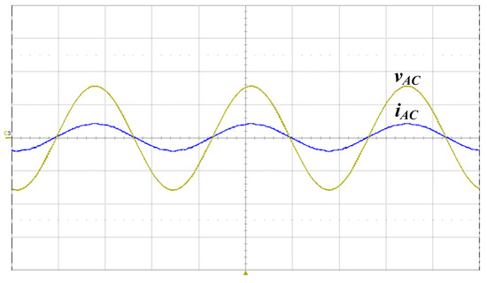 Experimental waveforms of the input AC mains voltage vAC (100 V/div) and the AC mains current iAC (5 A/div); time scale: 5 ms/div.