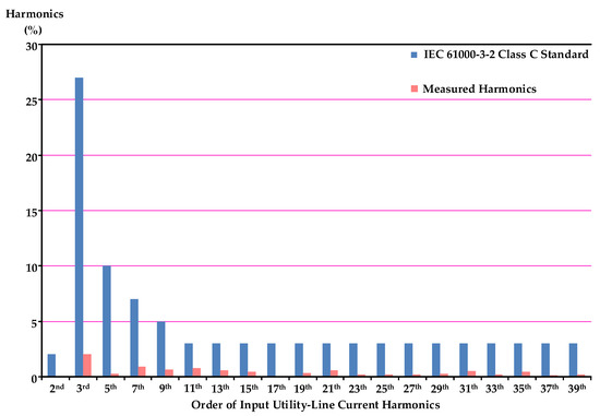 Measured harmonics of each order of the input AC mains current compared with the IEC 61000-3-2 Class C standard values.