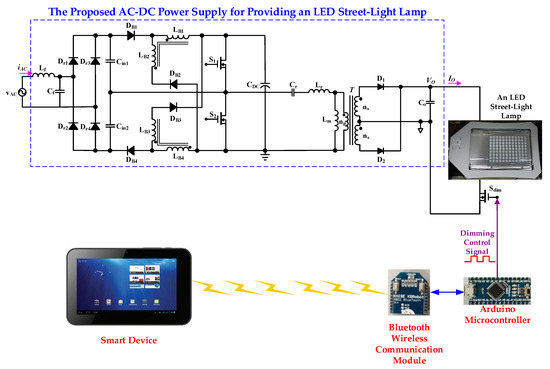 Figure 17 shows the architecture diagram of the proposed AC-DC power supply, which uses Bluetooth wireless communication technology to achieve the function of remote digital dimming control of the LED street-light lamp. In the wireless dimming control scheme of the LED street-light power supply circuit, the dimming control command sent by the administrator through the smart device (for example a smart tablet, a smart pad, or a smartphone) is sent to the microcontroller (Arduino NANO) via the Bluetooth wireless communication using a Bluetooth communication module (the model name is HC-05). Then, the dimming control signal from the microcontroller is sent to the power switch Sdim, which is connected in series with the LED street-light lamp and that is responsible for dimming control. By changing the duty ratio of the digital dimming control signal (from 100% to 20%) fed into the power switch Sdim, we can achieve the process of dimming and controlling the LED street-light lamp at 100% to 20% of the rated output power using Bluetooth wireless communication.