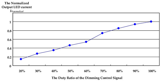 Table 5 demonstrates the measured output current IO of the LED street-light lamp when the duty ratio of the dimming control signal ranged from 20% to 100%. The measured output LED street-light lamp currents were 0.591 A, 1.063 A, 1.378 A, 1.811 A, 2.127 A, 2.914 A, 3.347 A, 3.702 A and 3.938 A when the duty ratio of the dimming control signal was at 20%, 30%, 40%, 50%, 60%, 70%, 80%, 90%, and 100%, respectively. Moreover, the normalized value of the output LED street-light lamp current, IO, normalized, is defined as the measured LED current divided by the rated one during the dimming process. By utilizing the measured data as shown in Table 5, the graph in Figure 18 shows the relationship between the duty ratio of the dimming control signal and the normalized output LED current IO, normalized. Additionally, the minimum value of the normalized output LED current was 0.1471, while the duty ratio of the dimming control signal was 20%.