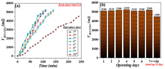 (a) Kinetics of gas production and (b) total gas volume produced every operation’s day. Conditions: (Ru/PP3) (9 μmol) in tri-glyme:water (v/v = 10 mL:1 mL) solution which contained FA and 10 mmol of KOH at 85 °C.