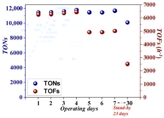 Monthly operation: After the catalytic system had accomplished a weekly operation as described above, it was put in standby mode by cooling, with no FA added, under ambient P, T, for 3 weeks. Then, a month after the first operation of the catalytic system, a new dose of FA (1 mL) was added and upon heating at 85 °C the production of gasses started over again. Then, when the FA was consumed, another dose of FA was introduced into the reactor and so on, till 5 successive doses of FA had been added. The total volume of gasses produced from catalytic decomposition of FA by the (Ru/PP3) per day is presented in Table 1 and Figure 1. Each entry in Table 1 represents an operating day of the catalytic system. On Entry 1 the catalytic system decomposed in total 5 mL of FA (2 mL at the beginning, plus three additional doses of 1 mL each), providing in total 5.1 L of gas within 110 min and achieving TONs = 11468 and TOFs = 6267. During the second operation day (Entry 2), the same amount of FA (5 mL) was consumed within the same period (110 min), producing 5.12 L of gasses with TONs = 11513 and TOFs = 6291 h−1. In the same manner in Entry 3 and 4, the catalytic system maintained the same reactivity, where the produced gas volume was 5.18 L in 110 min with TONs = 11648 and TOFs = 6365 h−1,and 5.25 L with TONs = 11806 and TOFs = 6451 h−1 correspondingly On the fifth operational day, the catalytic system showed slight fatigue, since it required 140 min to consume 5 mL of FA; however, it produced the same volume of gasses (5.11 L) with analogous TONs (11,491), but with reduced TOFs = 4931 h−1. For the next two days, the catalytic system showed an analogous functional profile as ton he 5th day, i.e., 6th day: FA (5 mL), reaction time (140 min), gas volume (5.1 L), TONs = 11,468, TOFs = 4922 h−1; 7th day: 5 mL of FA, reaction time (140 min), gas volume (5.2 L), TONs = 11,693, TOFs = 5018 h−1. As mentioned above, after this operation the catalytic system was left at ambient conditions for 23 days and the catalytic system was retested for its ability to decompose FA. Thus, it was observed that it was able to produce 4.5 L of gasses from 5 mL of FA within 240 min with TONs = 10,119 and TOFs = 2529 h−1 (Table 1, Figure 1).From the above description, it is clearly demonstrated that the catalyst (Ru/PP3) remains unimpaired, showing a steady activity for a whole week, with gas production of 5.2 L/day, thus 36.0 L in total after a total operation time of 14.3 h (Figure 1b). At this point, it is underlined that, a month after the first use of the catalyst, it remained active, producing 4.5 L of gasses, i.e., a decline of catalytic performance of 13% vs. its initial performance. After the 5th operation day, the kinetics of H2 production showed a slight delay (see Figure 1a). This is reflected in the rate of gas production that was 70–80 mL/min for the first four operation days, vs. 50 mL/min measured on the 7th day, vs. 30 mL/min after a month (see Figure S2). The TOFs showed analogous trends i.e., as visualized in Figure 2 which presents the overall trends of TONs and TOFs values vs. operation days. The data in Figure 2 demonstrate the long-term stability and durability of the studied system, which accomplished up to 90,000 TONs. We should underline that a marginal diminution of 13% occurs only in the case of TOF (manifested by a drop in the catalytic rate). The TONs indicator remains just the same. This could be attributed to a minor deactivation of the catalyst, but the exact reason should be further investigated. Up to this point, the Electron Paramagnetic Resonance data (Supplementary material, Figure S4, spectrum (iv)) shows no RuII oxidation at the end of the reaction. Moreover, the formation of Ru-carbonyls could be confirmed via Raman and ATR spectroscopies, something that in our study is excluded. Another less plausible explanation could be the accumulation of water after the sequential additions of FA (2.5% (v:v) is contained in the FA stock, as obtained from the supplier). The same phenomenon was observed in similar studies [,].
