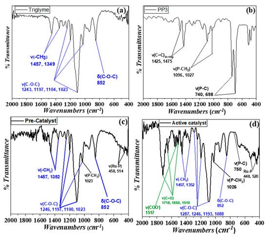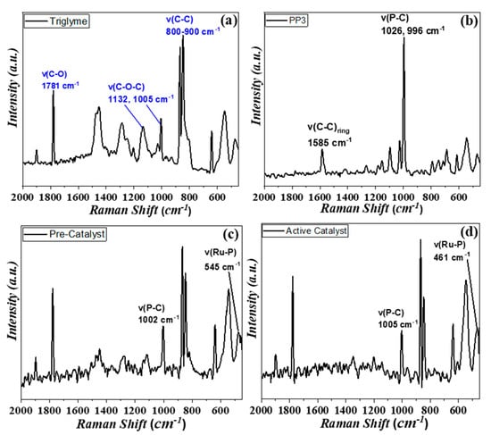 The v(C-C), v(C-O-C), and v(C-O) vibrations in the Raman spectra (see Figure 3a) and the δ(C-OC), v(C-O-C), and v(-CH3) bands in the ATR spectra (see Figure 4a) are attributed to the tri-glyme solvent. The intense frequency shifting, from 545 cm−1 to 461 cm−1 (Ru-P Streching), and from 996 cm−1 to 1002 cm−1 and 1006 cm−1, (P-C stretching bond) are attributed to the formation of the catalytic complex (Ru/PP3) (Figure 3c,d respectively).