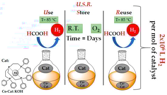 Concept of U.S.R. (i.e., Use-Store-Reuse) technology. The catalytic system is set for H2-production at T = 85 °C (Use), stored under ambient P, T, O2 (Store), and Reused at T = 85 °C. The system during the whole operation (weekly and monthly) produced >2 × 106 L of H2 per mole of catalyst.