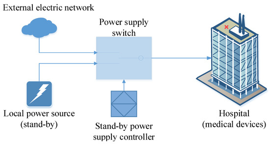 As mentioned earlier, medical equipment often requires a continuous power supply. This is secured by providing redundancy of power sources. In the case of hospitals, these are usually accumulator batteries or engine generators. For the purpose of this article, the authors adopted a redundant power supply system with a stand-by power supply unit but without delving into its technical details. A rough diagram of the analyzed power supply system is presented in Figure 1. It is a block diagram.