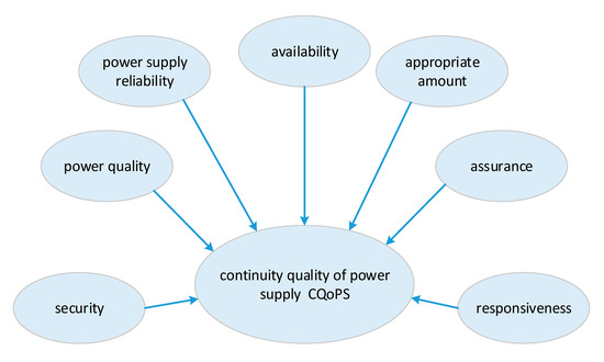 Quality can be described in many ways. There are standards that describe quality, such as ISO 9000. However, these definitions are quantified for a specific application as a standard. This article adapts the concept of quality perception based on reports and publications related to the Massachusetts Institute of Technology Information Quality (MITIQ) Program [30]. This is where, among other things, an information quality model based on sixteen dimensions and over a hundred of their features was devised [31] On the basis of research and analysis conducted at MITIQ [30], as well as on our own study [15,16,17,18,32], the CQoPS model was based on quality dimensions. Such an adaptation is a completely new approach to the assessment of power systems. This kind of assessment takes into account not only the reliability elements but also many others, which may be dependent as well as independent and subjective. Many dimensions of the CQoPS were taken into account, as shown in Figure 2. Here are these dimensions: