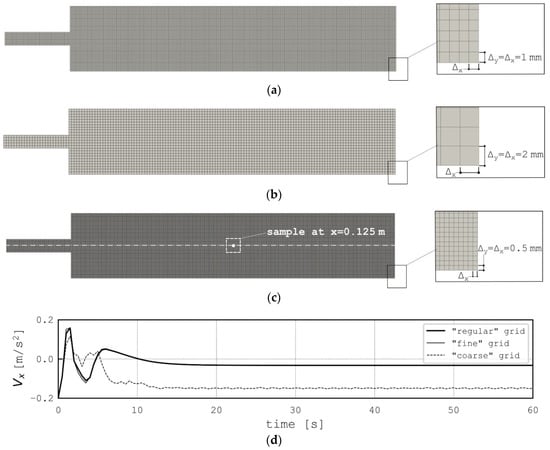 Governing equations of the suspension was discretized by a 2D structured grid, a constant spatial resolution of 1 1 was applied throughout the entire flow domain, as shown in Figure 1, and from then on it would be referred to as the “regular” grid or simply the “grid used”. To confirm grid independence of solution, simulation was conducted with different levels of spatial resolutions. Two of them could be found in Figure 1, namely a “coarse” and “fine” grid, as the corresponding step size was 2 and 0.5 , respectively. Calculations on all three grids converged reasonably without numerical stability issues. Additionally, the velocity in the X direction () was sampled at the geometric center of the expanded channel, namely at the location (x = 0.125, y = 0). As shown in panel (d) of Figure 1. In fact, for the “fine” and “regular” grid, both velocity profile and solid volume fraction distribution converged into quasi steady state after flow time (t) = around 20 s, due to the strong diffusion effect of RANS turbulent model. However, velocity profile of the “coarse” grid calculation kept oscillating, even the ensemble mean value was quite different from the predictions of finer grid, as shown in Figure 1d. As refining the “regular” grid brought little difference on the simulation results, we assumed that the evenly distributed 1 mm step size was sufficient for current study, at least in terms of grid independency. The discussions of analysis of the simulation results were based on the “regular” grid. For a more detailed verification study of the numerical setup, please check Appendix B.