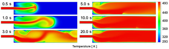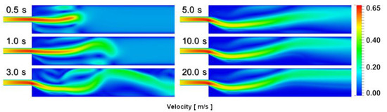 Figure 3, Figure 4 and Figure 5 showed the evolution of the velocity, solid volume fraction and temperature fields, predicted by the proposed two-way coupling particle flux model with gravity considered. From the first 1 to 3 s, the high-velocity region gradually moved towards the direction of the gravity. At 20 s, the velocity field was almost fully developed. Along the flow direction, the high velocity region firstly leaned towards the bottom wall after the expansion, and then climbed towards the opposite direction, induced by the evolution of volume fraction distribution. It could be found that almost all the solid particles settled down rapidly near the bottom wall, as shown in Figure 2c and Figure 4c. This should be related to the large particle size and density difference between the particles and suspending fluid. Furthermore, Figure 4 showed that as the flow evolved, the particles sediment region kept growing along the flow direction. Within the first 3 s, the sediment region maintained a streamlined shape, while as the front of the sediment was pushed further away from the inlet, the tailing slope of the interface between the sediment and suspending fluid becomes steeper. This could be explained as that the settled particles far away from the sudden expansion were transported from the surface of the upstream sediment rather than settling down from the main stream of the flow (by gravity effect). The temperature profiles of the suspension, as displayed in Figure 5, evolved towards a more uniform distribution during the process of sedimentation. The temperature distribution in the bottom corner, in particular, is even more uniform compared with the rest of flow domain, due to the effect of the particle flux.