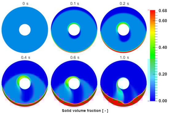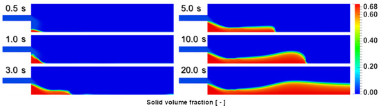 Volume fraction of the solid component at different time steps predicted by the proposed particle flux model.