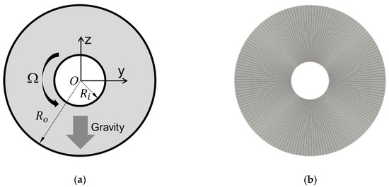 In this section, the performance of the proposed particle flux model was evaluated by another benchmark problem: flow between two rotating cylinders. This problem was quite common in engineering applications, such as the bearing flow and the well drilling flow in the oil and geothermal industry. Figure 6 showed the geometry of the two cylinders. The radius of the inner and the outer cylinders were 0.64 and 2.54 , respectively. The inner cylinder was rotating at 180 RPM and the outer cylinder is static. The kinetic viscosity of the suspending fluid was set as , leading to a hydraulic Reynolds number around , so the entire flow region could be regarded as fully developed turbulence [42,43,44]. The temperature of the outer cylinder and the inner cylinder were 393 K and 293 K, respectively. To speed up the simulation, firstly a steady state calculation was carried out without considering the motion of either fluid or solid, then the temperature profile of the steady state solution was used as the initial condition of transient calculation. The initial velocity of transient calculation is 0 , and the initial solid volume fraction is 0.1. The gravity was along negative Z-direction. The other parameters and flow conditions were kept unchanged with the previous case.