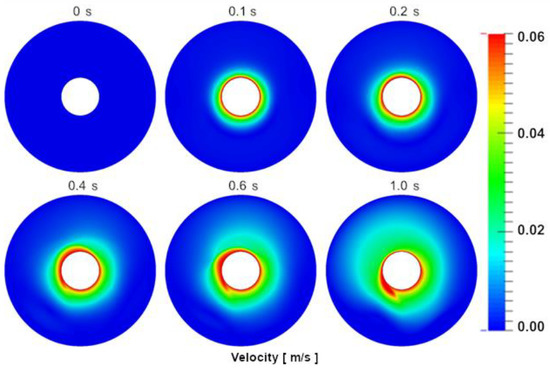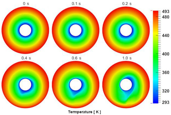Figure 8, Figure 9 and Figure 10 show the evolution of velocity, solid volume fraction and temperature fields at different time steps. From Figure 8, we can see that as flow time increases, the solid particles migrated towards the bottom wall of the outer cylinder. Due to the effect of the rotation of the inner cylinder, the particles settling on the top wall of the inner cylinder was not symmetric along the y direction and those particles moved gradually towards the bottom of the outer cylinder. We might infer that if the inner cylinder was static, the time required to complete the particle sediment towards the bottom of the outer cylinder would be much longer. Figure 9 shows an obvious effect of the particle sediment on the velocity field. Near the inner cylinder, the high velocity region always corresponded to the high concentration of the solid particles where the viscosity also took high values. Figure 10 shows the temperature evolution with the increasing of flow time. Near the top wall of the outer cylinder, the high temperature region was slightly shifted towards the direction of gravity, as shown in Figure 10 for t = 0 s and t = 1 s. This could be attributed to the enhancement of heat transfer termed from the particle flux, which was strongly controlled by the force of gravity due to density difference between solid and fluid.