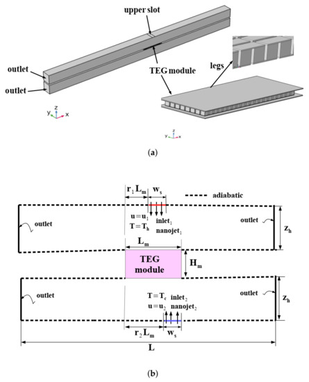 Thermoelectric conversion for nanojet impingement is considered. Three dimensional and two dimensional configurations with boundary conditions are shown in Figure 1a,b. A thermoelectric generator (TEG) module is used that has target surfaces for the impinging nanojets of hot and cold fluid stream. The hot and cold fluid enters inlets with slot width of while hot and cold uniform temperatures have values of T and T. The distance between the TEG interface surfaces and inlets is . The horizontal location of the slot over the TEG device is also varying and the distances between the inlet slots to the device edges are and for hot and cold fluid streams with denoting the length of the TEG module. The jets have uniform velocities of and at the inlets while distance between the outlets is L. The TEG device has legs with equal width, length and height of 2 mm. Conductor width, length and thickness are 4.5 mm, 2 mm and 0.2 mm, respectively while the ceramic thickness is 0.3 mm. Table 1 presents the thermophysical properties of materials used in the TEG module.