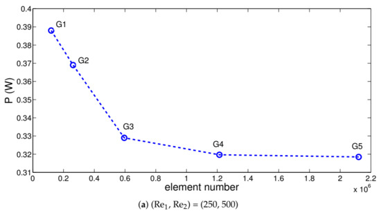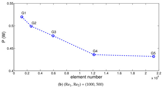 The simulation of the coupled field equations requires intensive computational time in 3D configuration. Grid independence tests are performed to achieve the optimal grid that the minimum computational time with accurate results. The test results for the generated power of the TEG device are shown in Figure 2 with different grid sizes at Reynolds numbers of (Re, Re) = (250, 500) and (Re, Re) = (1000, 500). Grid system G4 with 1,214,223 number of tetrahedral element is selected for the subsequent computations. The mesh is refined near the walls and at the interfaces.