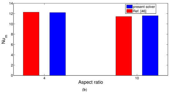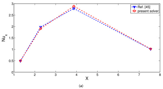 Comparison of local Nu number for various locations along the hot surface at Reynolds number of 100 with Ref. [45] (a) and average Nu number comparison for slot jet impingement cooling considering two values of aspect ratio at Reynolds number of 500 with Ref. [46] (b).