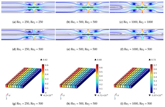 Effects of different jet stream Reynolds number combinations on the variation of streamlines within the channels, electric potential and temperature distributions within the TEG module ( (r,r) = (1,1), z = 3w, ).