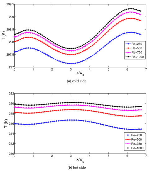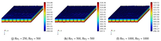 Figure 5 shows the effects of hot and cold nanojet stream Reynolds number combinations of (Re, Re) on the streamline distribution in the channels, electric potential and temperature variations within the TEG device ((r, r) = (1,1), z = 3w, ). Recirculation regions were established near the inlets of the hot and cold jet streams due to the entrainment and confinement effects. As the jet stream Reynolds number was increased, the size of the vortex increased while at the highest Reynolds number combinations secondary vortices away from the TEG device on the target surface were also established. The interface temperatures where hot and cold streams impinged varied with different Reynolds number combinations and this affected the electric potential and temperature distribution variation within the TEG device as shown in Figure 5g–l. There was 16% variation of the maximum electric potential when hot stream Reynolds number was increased from 250 to 1000. Peak values of hot and cold side temperatures also rose with higher fluid stream Reynolds numbers. Effects of hot jet stream Reynolds number on the variation of interface temperature of hot side and generated power are shown in Figure 6 with cold jet Reynolds number of 500. The hot side interface temperature and generated TEG output power rose with higher values of Re. The enhancement amount in the output power was 36% when cases with lowest and highest Re were compared. As the higher values in the (Re, Re) Reynolds number combination were considered, hot side interface temperature increased while the cold side temperature decreased as shown in Figure 7. The net effect was the increment in the generated power of TEG device as shown in Figure 8a. When lowest and highest Reynolds number combinations for hot and cold jet streams were compared, there was an almost 81.5% increment in the generated output power. The efficiencies were also increasing with higher values of Re and Re while the values were in the range of 4.2% and 5.2% and the increment amount in the efficiency was approximately 23.8% (Figure 8b).