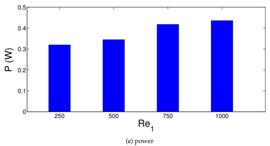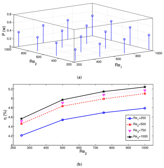 Generated powers (a) and efficiencies of the TEG device (b) with varying jet stream Reynolds number combinations ((r, r) = (1, 1), z = 3w, ).