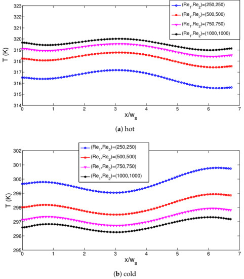 Effects of different jet stream Reynolds number combinations on the distribution of hot (a) and cold (b) interface temperatures (mid-axis) ((r, r) = (1, 1), z = 3w, ).