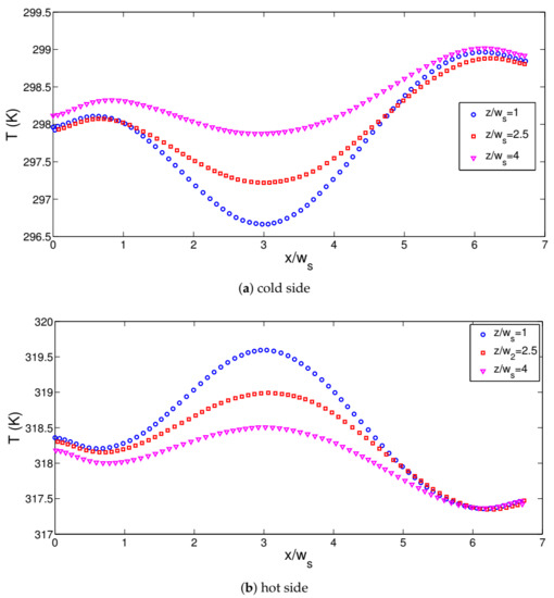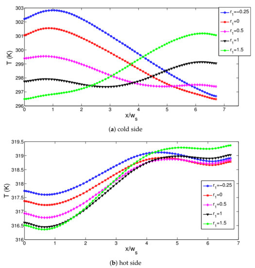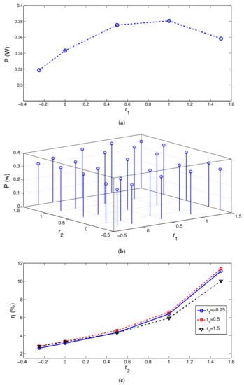 The location of the jet stream inlet on the TEG device was important since the highest temperature at the interface between the TEG device and jet flow was obtained in this location. Therefore, horizontal location of the cold and hot jet streams were varied and their combined effects were included with the parameter combination of (r, r). As the the value of r and r were varied, the location of the impinging part and established vortex near the inlet jet are varied. Therefore, variation of interface temperature and electric potential/temperature field variation in the TEG device were influenced as shown in Figure 9d–f. Cold side interface temperature variations with varying horizontal locations of cold jet stream are presented in Figure 10. The location of the lowest temperatures and characteristics of local distribution of interface temperature were affected with varying r. Generated power characteristics and efficiency variations are given in Figure 11 with varying r and r values. When the hot jet stream location was fixed to r = 0.5, the highest power was delivered for cold jet stream location at r = 1. However, when different combinations of horizontal locations were considered, the lowest value of power was obtained at location (−0.25, −0.25) while the highest one was attained at value of (1, 1). The variation in the generated TEG power at those locations was 43%. However, higher efficiencies were obtained with increasing the hot jet stream horizontal location from the TEG. When cases with (r, r) = (0.5, −0.25) and (r, r) = (0.5, 1.5) were compared, efficiency value rose from 2.8% to 11.40%.