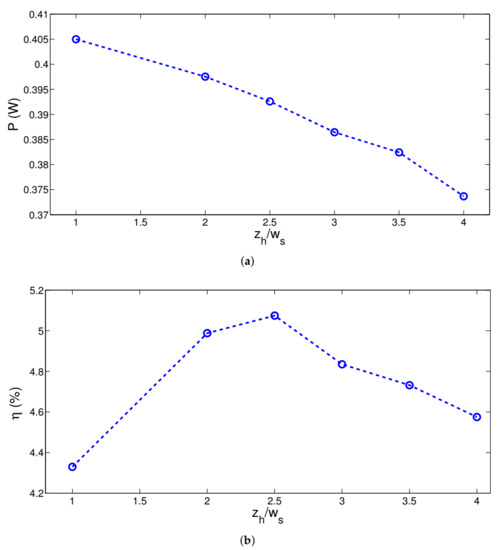 Generated power (a) and efficiency (b) of the TEG module with varying distance from the inlet to target surface ((Re, Re) = (500, 500), (r, r) = (1,1), ).