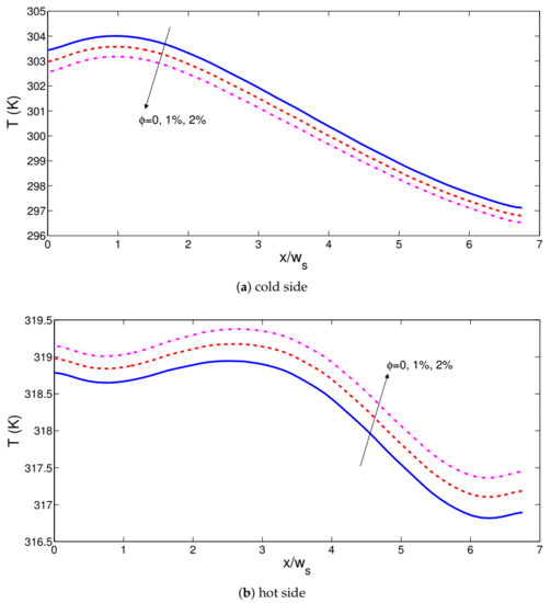 Impacts of solid nanoparticle volume fractions of CNT on the variation of cold and hot interface temperatures ((Re, Re) = (500, 500), (r, r) = (1, 1), z = 3w).
