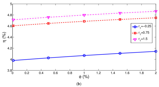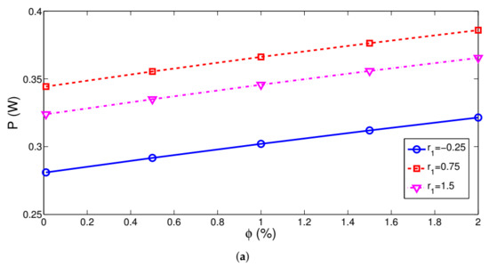 Nanojet is formed by using highly conductive CNT particles in the water jet considering different solid volume fractions of particles. Thermal transport features are greatly enhanced which the inclusion of nanoparticles. Variation of hot and cold side interface temperatures with varying solid volume fraction of the particles are shown in Figure 14 ((Re, Re) = (500, 500), (r, r) = (1, 1), z = 3w). The cold side temperature dropped and hot side temperature rose throughout the TEG interface surface with higher . Generated power and efficiency versus varying solid volume fraction showed a linear increasing trend for different (r, r) combinations (Figure 15). As compared to using a pure water jet, power enhancements were in the range of 12% and 14% with nanojet at the highest particle volume fraction. Highest efficiency of 4.87% was achieved at r = 1.5 with nanojet at the highest while the increment in the efficiency was only 3.5% as compared to the water jet.
