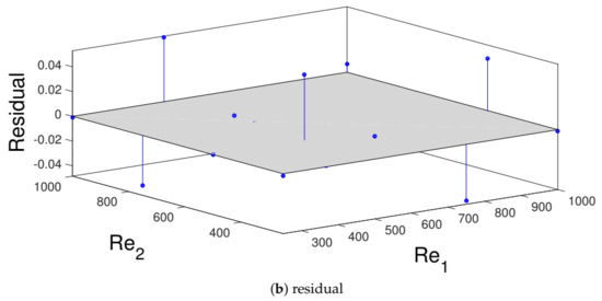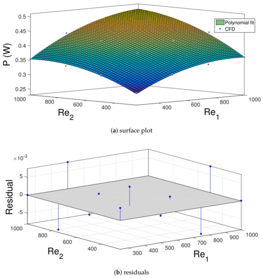 Polynomial surface fit (a) and residual (b) plot for the generated TEG power with varying jet stream Reynolds numbers at .