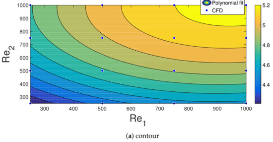 with the modified hot and cold jet stream Reynolds number as . Table 3 and Table 4 present the polynomial coefficients for the generated power and efficiency using water jet and nanojet. Goodness of the fit between the polynomial model output and CFD data could be described by R-square and RMSE (Root Mean Square Error). They were defined by using the following relations: