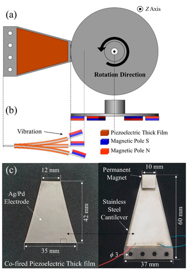 Figure 2a shows an illustrated schematic top-view image of a trapezoidal piezoelectric bimorph cantilever interacting with the rotor disk for magneto-piezo-elastic energy conversion. As will be introduced in the following discussion and as shown in Figure 3, the cantilever is one of six trapezoidal cantilevers comprising the proposed rotary energy harvester. The trapezoidal cantilever is tightly fixed with a rigid body at a position denoted by four holes on the trapezoidal substrate. The disk corresponding to a rotor can rotate along the z-axis, of which the direction is perpendicular to this page, as shown by the counter-clockwise circular arrow. The magnetic coupling effect can arise between two interacting PMs; one is the proof-mass of the clamped cantilever and the other is a rotating magnet affixed onto the bottom surface of the rotor disk. As an example showing the magnetically attractive interaction, a side-view image of the schematic of Figure 2a is also depicted as Figure 2b. The deflected piezoelectric cantilever can generate electricity via the transferred strain of the piezoelectric thick films attached to the deflected substrate beam under the effective magnetic field. For a magnetically driven vibration mode, the trapezoidal piezoelectric cantilever beam was designed to operate in the transverse mode, where the polarized direction is perpendicular to the direction of the applied stress. A planar electrode coated on both sides of a piezoelectric film is typically utilized to implement the transverse mode for electrical power generation. Figure 2c exhibits the Ag/Pd-electrode printed trapezoidal piezoelectric thick film and the cantilever beam with the attached piezoelectric thick film. The trapezoidal piezoelectric thick film, made of a conventionally used lead-zirconate-titanate (PZT) ceramic, was successfully obtained as designed in consideration of shrinkage during a co-firing process. It should also be noted that the Ag/Pd electrode was fully printed onto the surface of the piezoelectric film while assuming a homogeneous and clear surface. A small rectangular tab placed on the long side of the trapezoid serves as an electrical connection with the other electrode printed behind the film. Although the surface of the cantilever beam was slightly stained with the adhesive epoxy after the piezoelectric film was attached to the cantilever beam, it was not significant because the electrical output signals coming from the piezoelectric element were never affected by surficial epoxy blurring. Detailed numerical dimensions are also provided in Figure 2c.