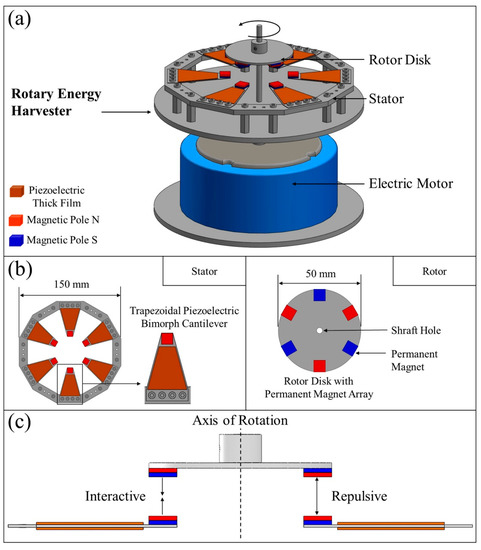 Figure 3a also shows a schematic illustration of the test equipment used for the evaluation of the power generation capability of the proposed energy harvester. As mentioned above, all six trapezoidal piezoelectric cantilevers used here constitute a dominant part of the stator to generate electricity from the proposed energy harvester. The cantilevers are horizontally aligned with the vertical axis in the center of the harvester and tightly clamped onto the dodecagonal frame, where its center is shared with the vertical center z-axis of the rotor disk. The proposed energy harvester was configured to generate electrical energy transferred from the rotational energy by the rotor disk on the basis of a magneto-piezo-elastic energy conversion mechanism, which can be helpfully referred to in a previous report [38]. Apart from the stator, the rotor disk with the PM is hung with a rigid shaft capable of rotating with rotation speeds controllable by an electric motor. A top-view image of the dodecagonal stator and a bottom-view image of the disk rotor are provided in Figure 3b. For the stator, the longer side of the trapezoidal cantilever is strongly adhered to one side of the dodecagonal frame by four screwed bolts, with the other side having one PM. Each PM has strong magnetism and so, as the distance between each PM gets closer, strong magnetic interference occurs. Such magnetic interference directly affects the harvester output performance and needs to be adjusted. When all the cantilevers are mounted on the dodecagonal frame, the minimum distance between the PMs attached to the cantilever is about 3 mm, and considerable magnetic force is generated. Repulsive forces act on each other because the magnets of the cantilever are arranged to have the same polarity, and the deformed state of the cantilever is maintained. To prevent this problem, six cantilevers were mounted on a dodecagonal frame to ensure a distance at which magnetic interference was negligible. Magneto-piezo-elastic energy conversion is closely related to the number and placement of magnets. In the case of circular motion, some pairs of PMs must be in a state of magnetic-equilibrium. Here, the magnetic-equilibrium state is one in which magnetic forces of the same magnitude act at the same time and the same number of attractive forces and repulsive forces can act simultaneously. As for the number of PMs that satisfies these conditions, an even number of PMs must be applied to each rotor and stator. If magnetic-balancing is not achieved, the output power decreases due to the resistive torque generated in the asymmetric structure.