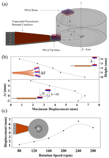 Figure 4b exhibits the deflection (∆δ) of the end tip of the trapezoidal beam under alternating attractive and repulsive magnetic force as a function of the height, radius and rotation speed of the rotor disk for the energy harvester. The linearly increasing tendency of the maximum displacement with decreases in the height and the radius was examined. As the magnetic field intensity between two cuboidal PMs is even stronger when their own larger surfaces face each other, the arrangement of PMs was determined to be identical along the vertical direction but different along the horizontal direction. In these cases, the rotation speed of the rotor was held constant at 240 revolutions per minute (rpm). At a height exceeding 14 mm, the beam was not deflected due to the excessive distance out of the effective magnetic field. The optimized height of the rotor disk is evaluated as approximately 10 mm, where the piezoelectric cantilever beam cannot only be highly deflectable but also mechanically stable without the occurrence of cracks. It is also evident that the highest value of ∆δ can be obtained when ∆r approaches zero at the optimum height of 10 mm, implying the best arrangement of the PM pair. This displacement change can be known through a change in magnetic force generated between PMs of the rotor and cantilever. The magnetic force between two PMs can be calculated through a mathematical model with the equation below [39,40],