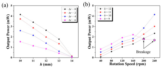 Output power of a trapezoidal piezoelectric bimorph cantilever with variation of: (a) the radius gap of ∆r, the rotor’s height of h; (b) rotation speed of the rotor.