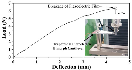 Load-deflection plot of the trapezoidal piezoelectric bimorph cantilever and testing image.