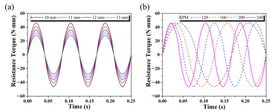 Calculated resistance torque of the rotary energy harvester under the effects of an attractive and a repulsive magnetic field according to the parameters: (a) height (h); (b) rotation speed (rpm) of the rotor disk.