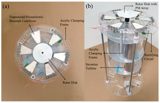 In this work, an energy harvester with consideration of the optimum design conditions was demonstrated for wind energy harvester applications. Figure 8a,b show photographic images of the fabricated wind energy harvester with the trapezoidal bimorph cantilever array, showing the top view and a tilted view, respectively. In order to obtain the best energy harvesting performance, a 10 mm height of h and no radius gap (∆r = 0) were applied to the wind energy harvester as the pertinent design parameters. The magnetically coupled trapezoidal piezoelectric cantilever array is shown at the dodecagonal frame of the stator in Figure 8a. At the top of the energy harvester in Figure 8b, the rotor disk holding the PMs on its bottom surface is shown to be connected to the center shaft along the vertical z-axis. Two custom-made acrylic plates as a top and bottom plate were used to support the double-stacked Savonius turbine blade and the dodecagonal stator frame, along with four stainless-steel pillars. Rectifying circuits to convert the AC signals out of each trapezoidal piezoelectric cantilever into DC were also included in the fabricated wind energy harvester.
