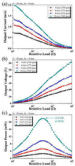 The energy harvesting performance of the wind energy harvester was depicted with variation of the resistive load from 1 kΩ to 1 MΩ. The output current, the output voltage, and the output power under a parallel electric connection of the piezoelectric cantilever array are plotted as a function of the wind speed when it ranged from 4 m/s to 10 m/s in Figure 9a–c, respectively. The increment of 2 m/s of the wind speed from 4 m/s to 10 m/s corresponded to the following amplitudes of the rpm: 110, 175, 210, and 240, respectively. It was not tested at the higher rpm of 240 because the corresponding wind speed is sufficiently high as 10 m/s and because the output power would be reduced during operation away from the resonant frequency, as confirmed in Figure 4c. With an increase in the resistive load, the output current tended to decrease but the output voltage increased. As expected, an increase in the wind speed could result in an enhancement of both the output voltage and the current. The output power, which equals the output voltage multiplied by the output current, shows a peak near 30 kΩ of the resistive load for all cases of the wind speed. The output power at the wind speed of 4 m/s was slightly low at 3 mW but reached a maximum value of approximately 22 mW with a further increase in the wind speed to 10 m/s. In Table 3, the resultant energy harvesting characteristics are summarized in detail. As the vertical distance between the magnets decreases, the magnitude of the magnetic force applied increases; this effect appears as an increase in output power of the piezoelectric material. When the height decreases from 14 mm to 13 mm, the magnetic force increases about 1.2 times, and when the height decreases by 1 mm to 10 mm, the magnetic force again increases about 1.2 times. It can be seen that the output power shows a trend similar to those of magnetic force. In addition, according to Equation (8) below, the energy of the wind is proportional to the cube of the wind speed [43].