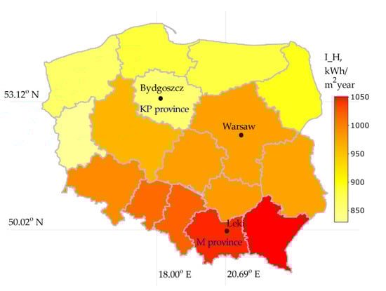 Yearly horizontal insolation in Poland calculated per province’s capital city. KP province—Kuyavian-Pomeranian; M province–Lesser Poland. Source own study based on [18].