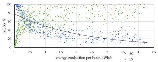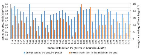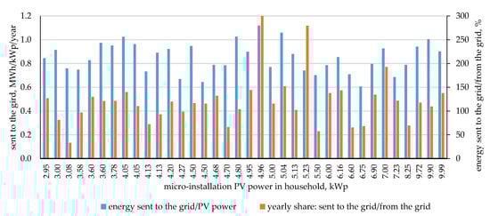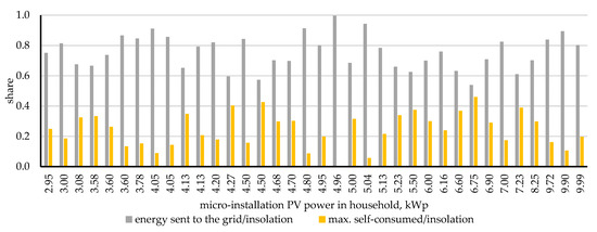 Based on insolation measured in Lesser Poland province (1124 kWh/m2/year [29]) and energy sent to the grid measured (Figure 2) in each installation theoretical maximum value of self-consumed energy was calculated (Figure 3) The average (for this province) maximum value of the self-consumed energy share was obtained as 24%. Mean value of selected PV installation power is 5.18 kWp but for above-mentioned the biggest grants program “My electricity” mean PV installation power value in 2019 was 5.39 kWp (obtained for 3060 microinstallation [15]). Theoretically, the more production is sent to the network, the lower the self-consumption rate can be.